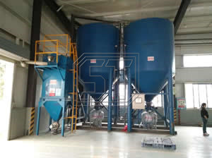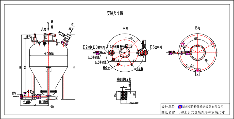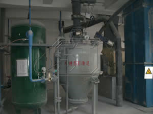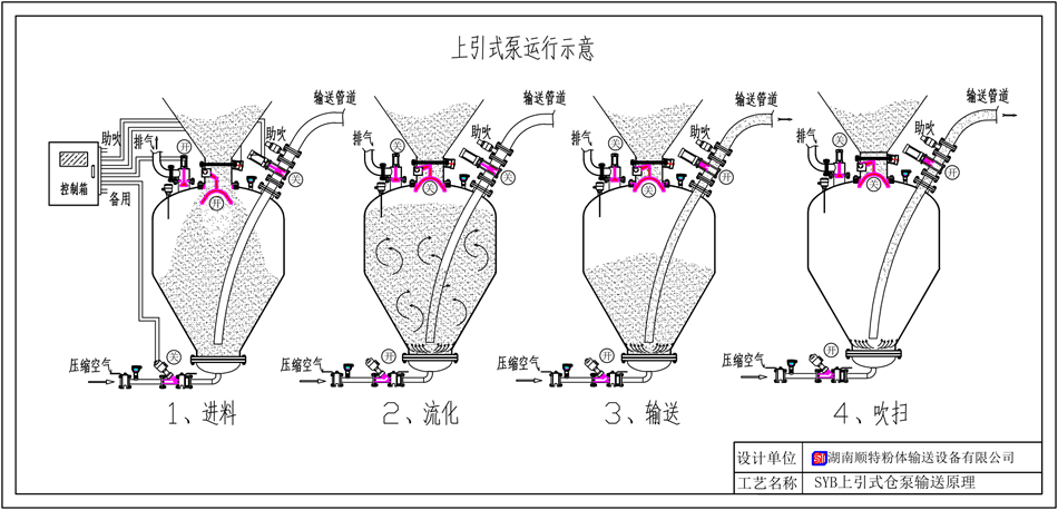 SYB 系列上引式粉體輸送泵運(yùn)行時(shí), 首先開(kāi)啟進(jìn)料閥和排氣閥, 粉體從倉(cāng)泵進(jìn)料閥口進(jìn)入泵體內(nèi), 泵內(nèi)空氣從排氣閥溢岀, 待料位計(jì)檢測(cè)倉(cāng)滿時(shí), 進(jìn)料閥和排氣閥自動(dòng)關(guān)閉, (為防止料位計(jì)損壞設(shè)備失控時(shí),進(jìn)料設(shè)有備用時(shí)間控制)。當(dāng)儀表檢測(cè)到符合輸送壓力值時(shí),氣源控制閥等自動(dòng)開(kāi)啟, 待泵內(nèi)壓力上升至設(shè)定值后,自動(dòng)開(kāi)啟出料閥和助吹閥, 粉體在壓差和助吹流化作用下高速進(jìn)入輸送管道, 在輸送中待泵頂壓力下降到一定值時(shí), 表明泵內(nèi)粉體己輸送完畢,自動(dòng)延時(shí)將管道吹掃干凈后關(guān)閉氣源控制閥和助吹閥。即完成一次輸送,進(jìn)入下一循環(huán)。空氣經(jīng)倉(cāng)頂料氣分離器過(guò)濾后排入大氣,粉體在重力作用下落入受料倉(cāng)內(nèi),完成粉體輸送。