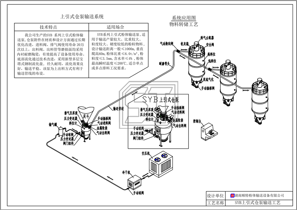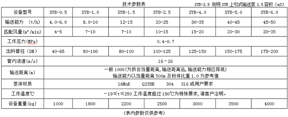 SYB 系列上引式粉體輸送泵,適用于輸送產(chǎn)量較大、比重較大、粒度較大、硬度較低的粉粒物料, 設(shè)計(jì)當(dāng)量輸送距離一般≤1000 m,垂直爬高60m, 粉體比重≤6.0 t/m³, 粉粒度≤5.0mm, 含水率≤3% ,粉體瞬時(shí)溫度≤200℃,適合單點(diǎn)或多點(diǎn)排料工況要求。